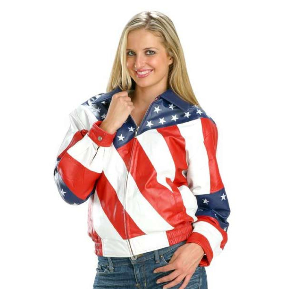 This funky Womens Jacket is manufactured by following the exact design of American flag. The top-notch quality of synthetic leather has been used to make this piece superbly durable with a nice shine. The blue, white and red combination with additional patterns of stripes and stars make is highly attractive and cool. It features a shirt style collar, full sleeves with buttoned cuffs and front zipper for smooth closure. Although this jacket comes with a baggy look, its waistline is prepared with stretchable fitting to let our ladies enjoy casualness with style!