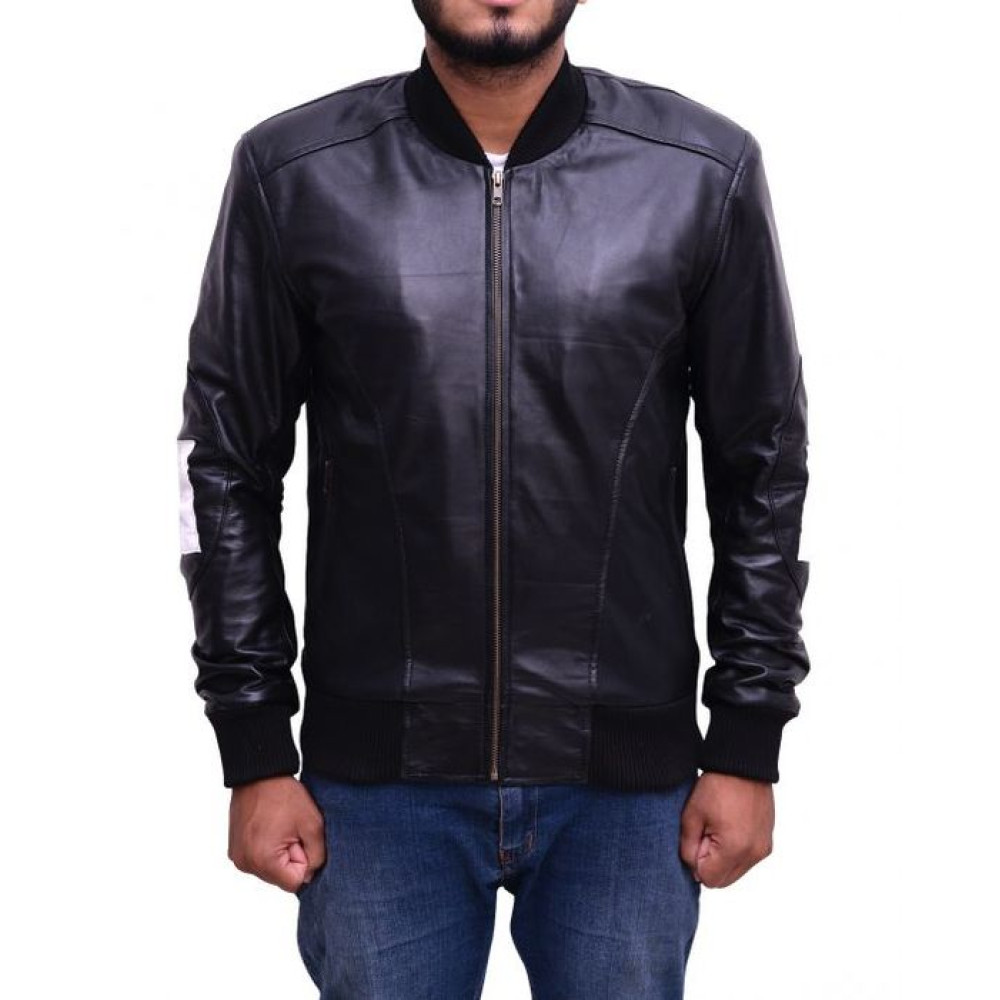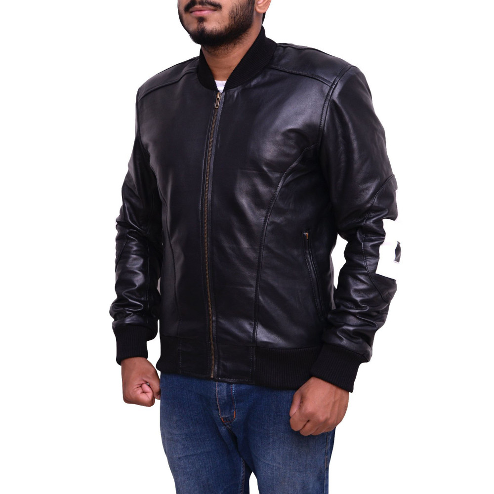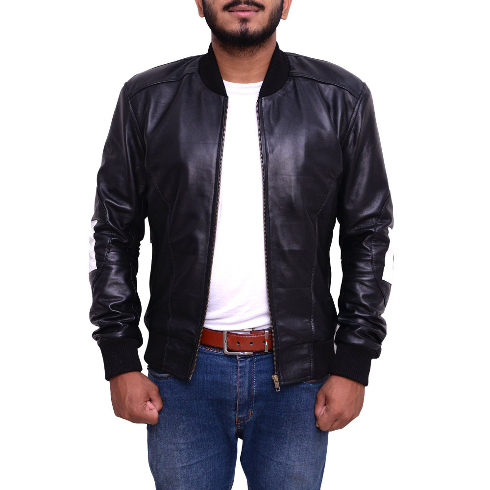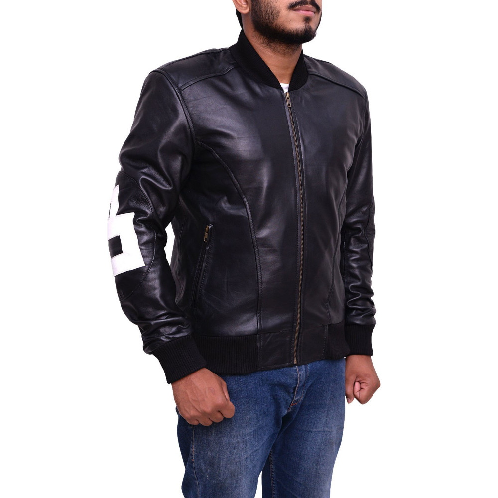 - This is 8 ball men’s bomber jacket. The material being used for this jacket is Real leather. it has inner viscose lining, design, YKK branded zipper closure, design, full-length sleeves with rib knitted cuffs, ‘8’ logo on sleeves in white color, two waist zipper pockets and two inner zipper pockets. This black jacket has been inspired by the famous game ‘8 ball pool’. This designer men’s jacket has been sewn with perfection and is perfect for bikers and all the dashing guys. You can comfortably move with this black leather jacket.