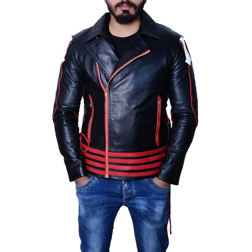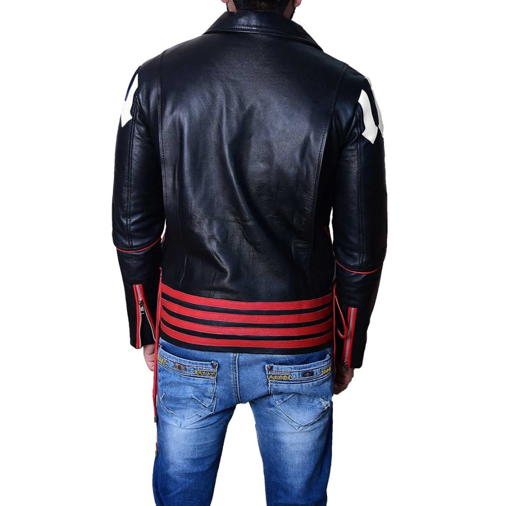 • The Freddie Mercury Jacket is made up of original leather material. It is available in shiny Red and Black color with stand-up collar. This Jacket has full sleeves with zippers and arrows on the shoulders. It has a symmetrical Branded zipper with button closure style. You would love to wear it on your bike ride. This Product also has complete internal viscose lining.