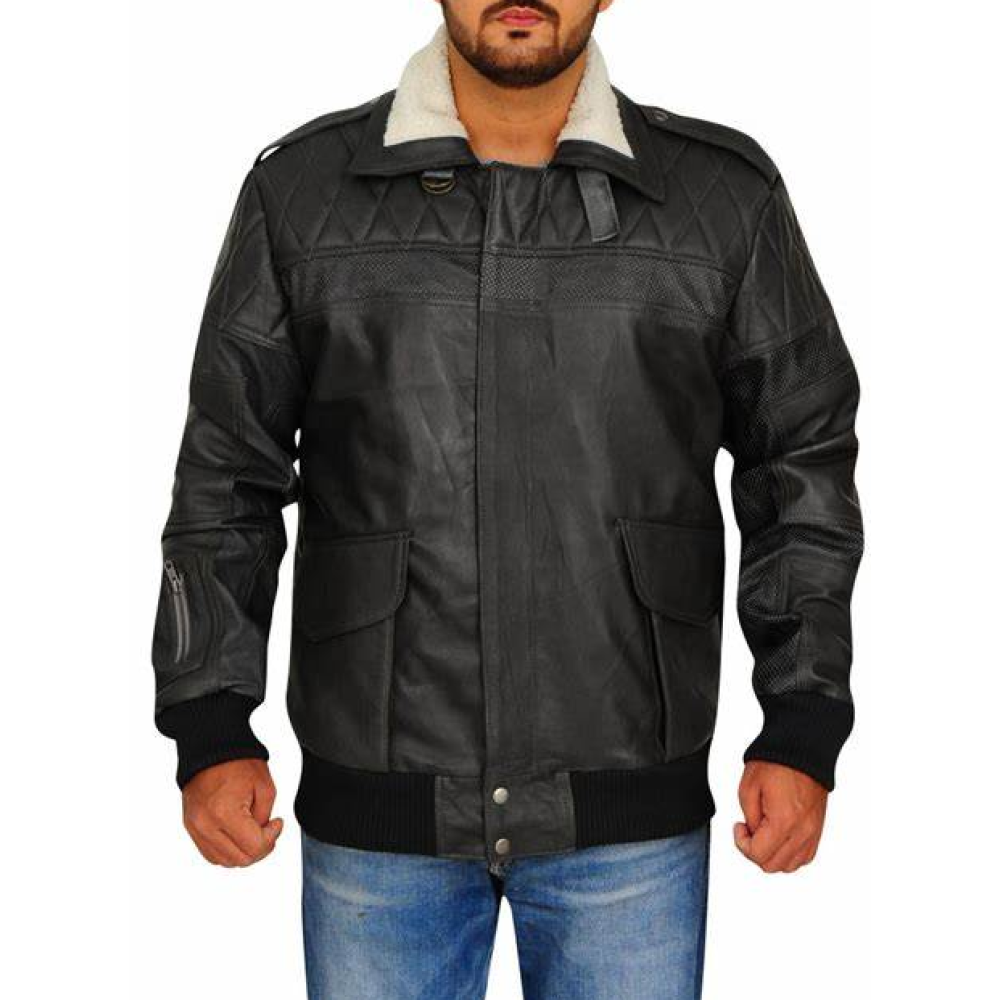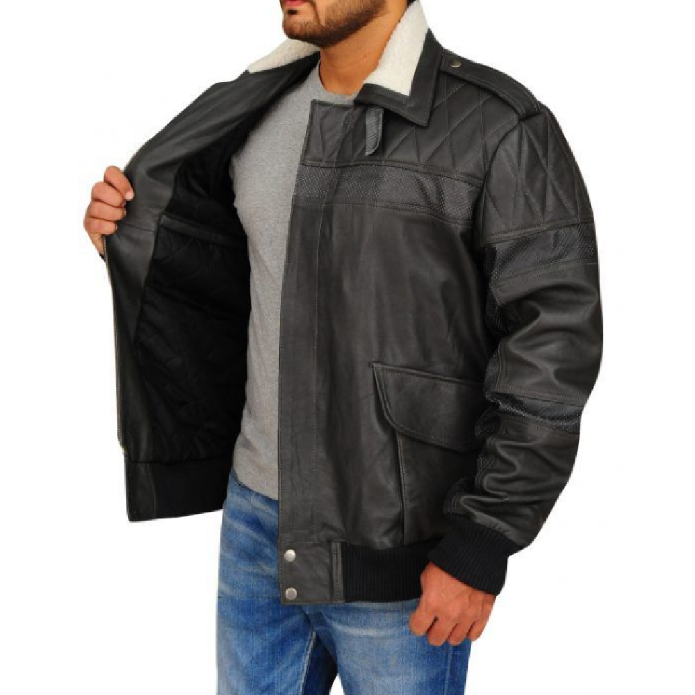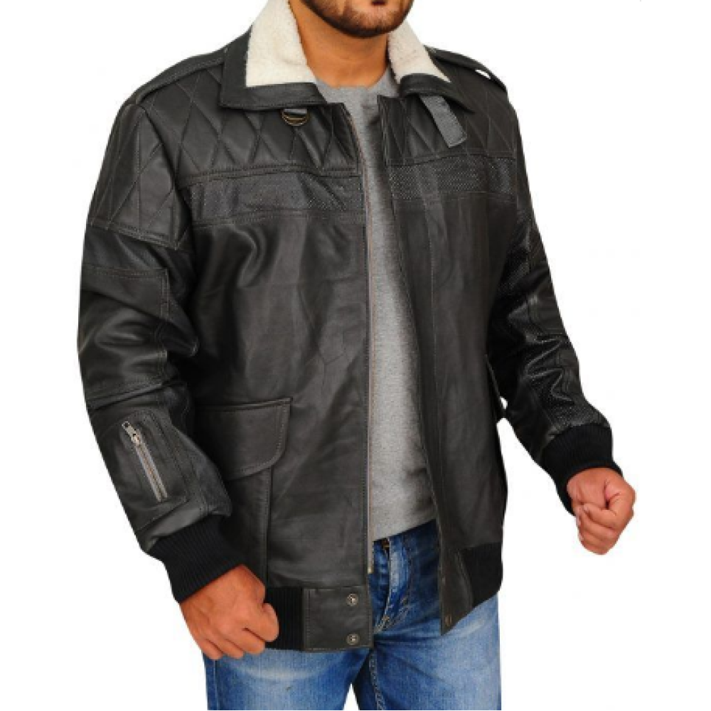 - The Ghost In The Shell Batou Jacket has been prepared with the fine use of real leather material. It’s a durable jacket that features faux fur collar and full sleeves with rib-knitted cuffs. Its shoulders are decorated with straps and quilted patterns. The design includes patches and stitching details on sleeves and chest in addition to pockets at sleeve. This decent grey jacket will surely enhance your look in cold season!