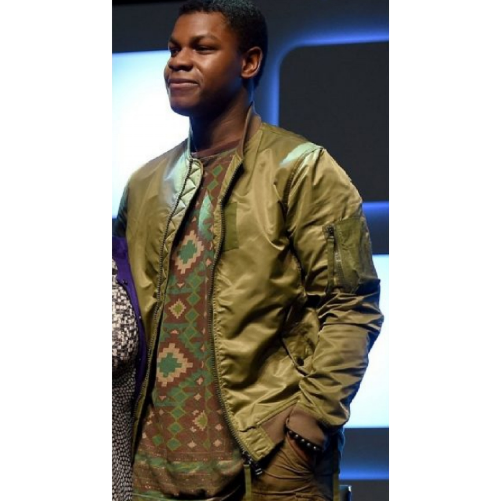 John Boyega at Rogue One Satin jacket is materially made up of Satin fabric Oval Green color. It has a front closure zipper, fit for convenience purpose. This jacket is also embedded with inside and front pocket for utility use. It is a full sleeve jacket available in all sizes. Other augmented features, to make you classy, include the round neck collar and the rib knitted cuffs and hems that enhance the aesthetic look of this jacket.