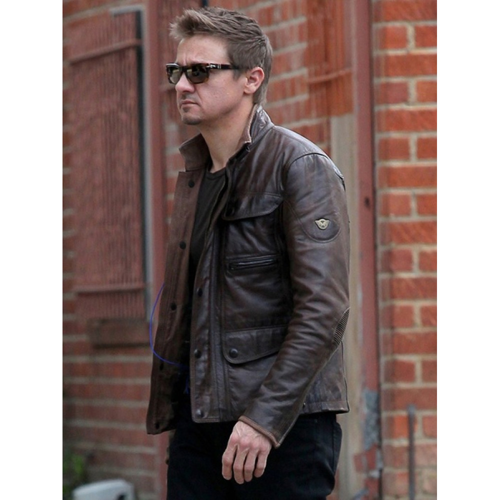 This astonishingly produced Jeremy Renner men leather attire is completed of Leather in brown color having internal viscose pleased lining. The stand up style collar, emblem on biceps, frontage flap and zipped pockets, snap-tab closure, open hem-cuffs; these outstanding traits make this terrific Jeremy Renner Los Angeles jacket clothing a finest buy for audacious men. Superb wear for laid-back activities, party & night outs, active occasions, college, shopping, and bikers.