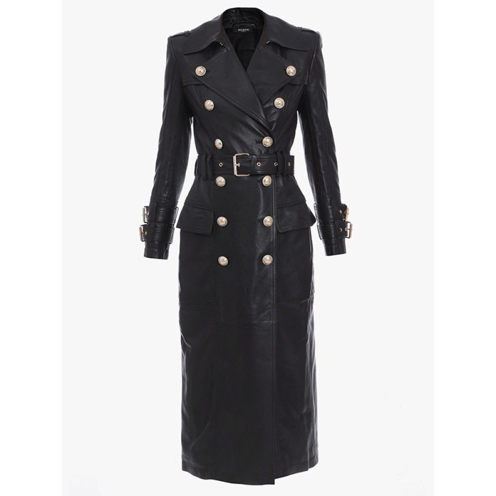 Long Black Leather Trench Coat For Women