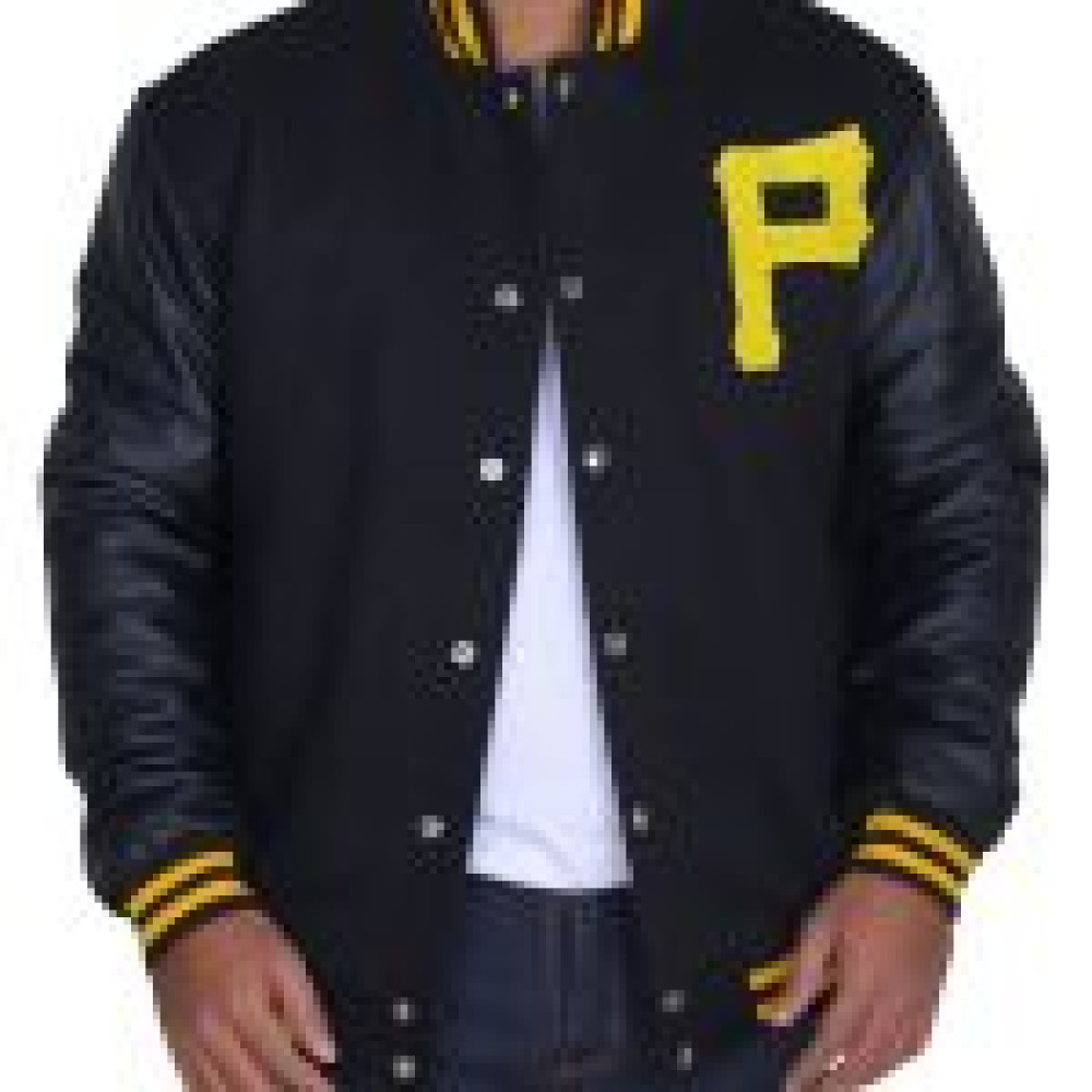 This magnificent Majestic Pittsburgh Pirates Letterman black jacket is made carefully of Cotton material in startling Black color. Consisting of a round striped collar, it comprises of front Buttoned conclusion, waist & inner pockets, a letter “P” on chest, leather sleeves with Yellow striped ribbed cuffs & hems making it a brave costume for men to look good-looking at sporty hangouts, clubbing, parties, shopping occasion, Halloween and Bikers. Therefore, order it today and get this along with global shipping, 100% money back guarantee.