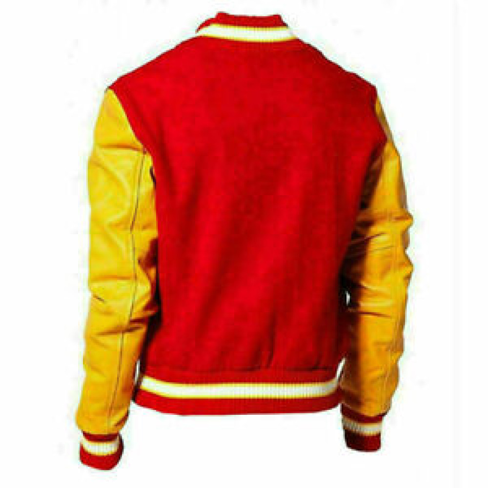 The Michael Jackson Varsity Jacket is made up of a nice combination of fleece, used for body preparation, and leather, adopted for sleeves finishing. It exhibits a catchy combo of sharp red and dull golden. Its round collar, waistline and cuffs are manufactured by implementing rib-knitted style. The front closure of this full sleeve jacket has been managed by using snap-tab buttons.