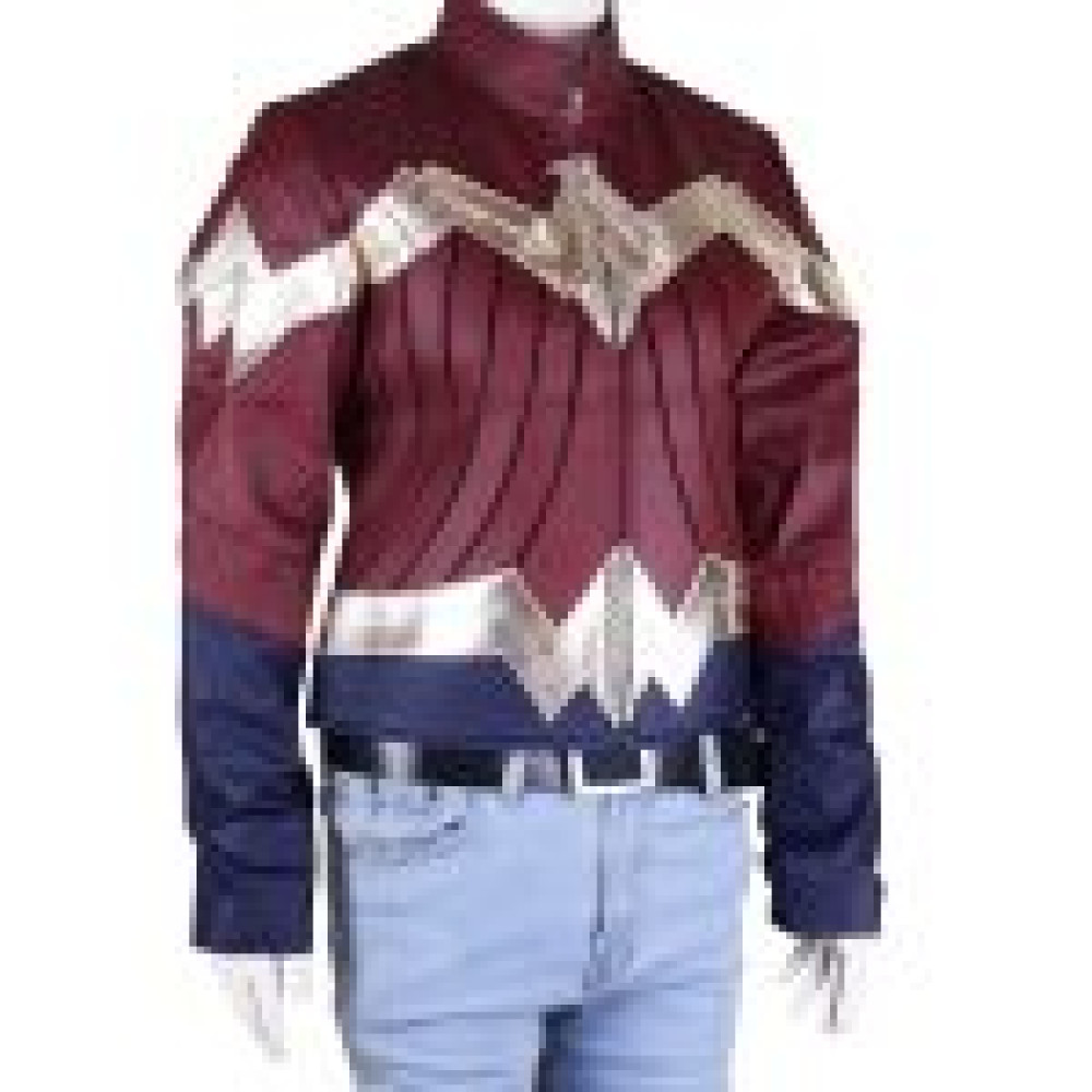 This New Wonder Women Jacket is made up of Faux leather material. It is available in elegant Maroon and blue Multi color combination. It has erect style collar and full length sleeves. The product also has internal viscose lining, Front branded zipper closure style and two pockets on the inside. Wearing this Costume Jacket will make you look like a super women.