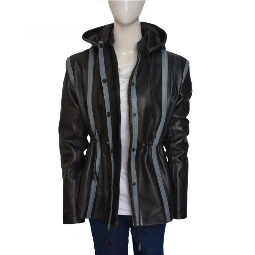 This jacket is manufactured using Faux leather in black color plus grey horizontal stripes all over. It features an inner viscose lining with inside pocket, a hooded style collar, full sleeves with open hem cuffs and a dual closure on the front with buttons and zipper. A string is also provided at the waist to adjust the fitting of this jacket.
