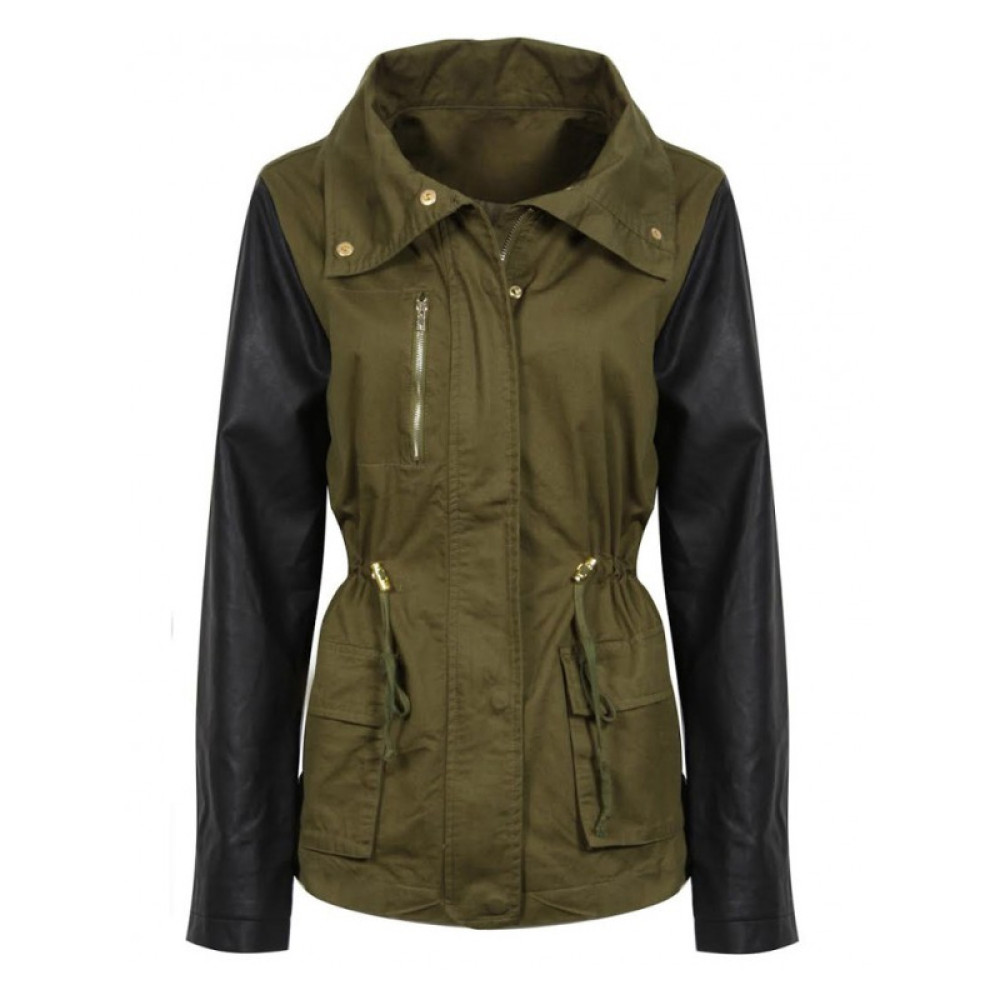 The Women’s Oval Green Jacket with Full Leather Sleeves has been prepared by using fine quality of cotton fabric and leather material. This premium piece is extremely comfy due to its neat inner viscose attachment. It has a broad collar that is folded and buttoned down. Front closure is managed with a zipper covered under a flap. At both sides of waste, the adjustable drawstring is installed for better fitting. Furthermore, it has two big flap pockets at waist and one zip pocket at chest.